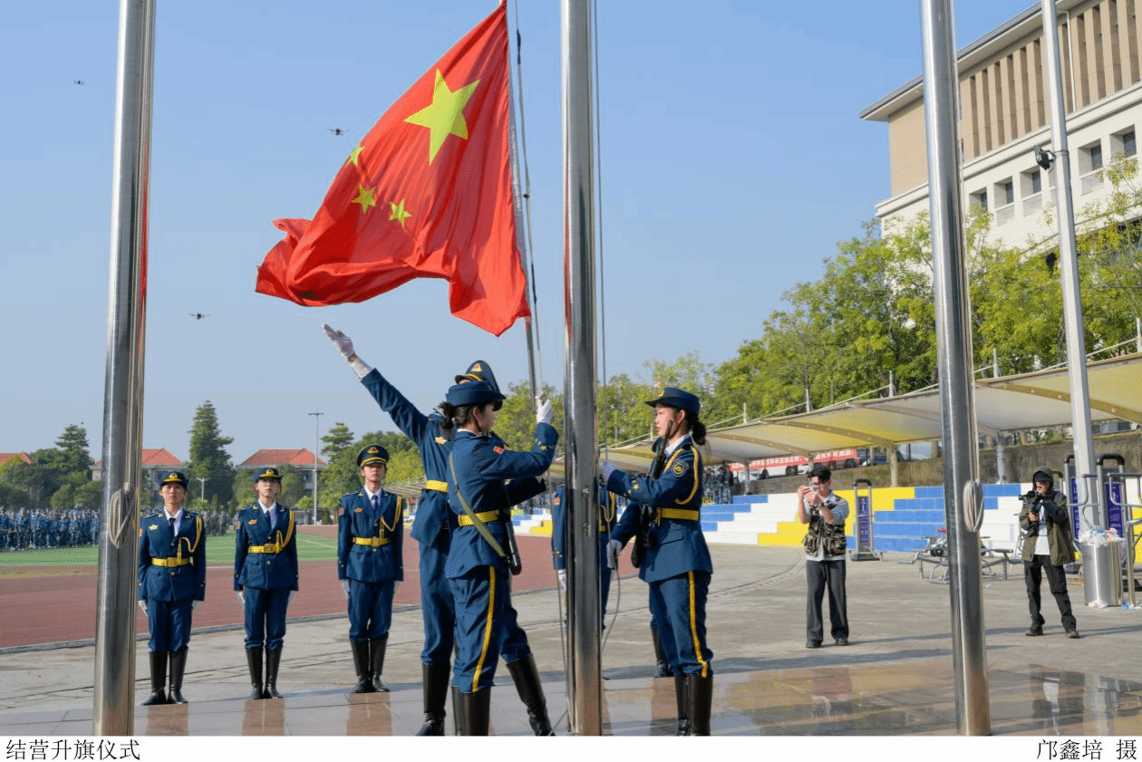 仪式现场,绿茵场上一片迷彩的海洋,各方阵整齐排列,同学们身姿挺拔,目光坚毅,仿佛在向大家诉说着这些天来的刻苦训练。随着激昂的国歌声响起,五星红旗冉冉升起,结营大会在国歌与礼炮齐鸣声中拉开帷幕。