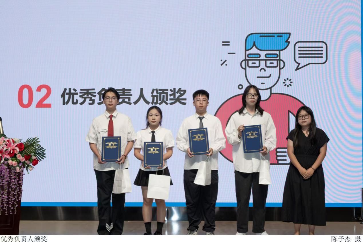 随后,激动人心的颁奖仪式拉开帷幕。主持人依次宣读了优秀负责人、优秀干部、优秀干事等多个奖项的获奖名单,副书记苏庚华和组织指导老师彭晓芳为表现优异的个人和团队颁发了荣誉证书及奖品。获奖代表们步伐坚定地走上领奖台,脸上洋溢着自豪的笑容,现场掌声雷动,这不仅是对获奖者的认可,更是对同学们的激励与鼓舞。
