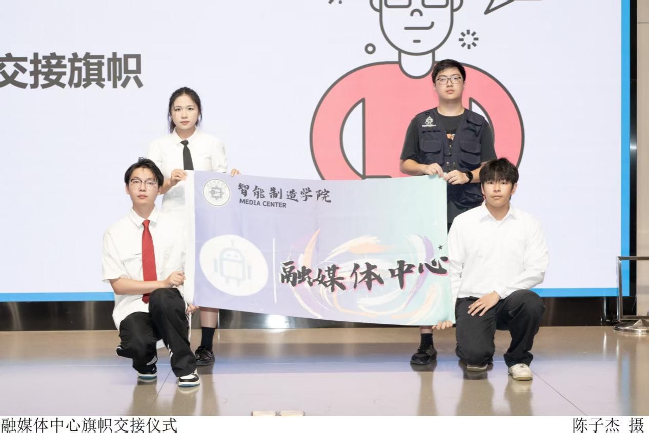 接着,新老干部庄严郑重地进行了交接旗帜。象征着智院融媒体中心的组织旗帜由双方展开展示,而后被庄重地交到了新任干部手中。相信在新一届学生干部的带领下,融媒体中心将会更好地稳步前行,传承发展。