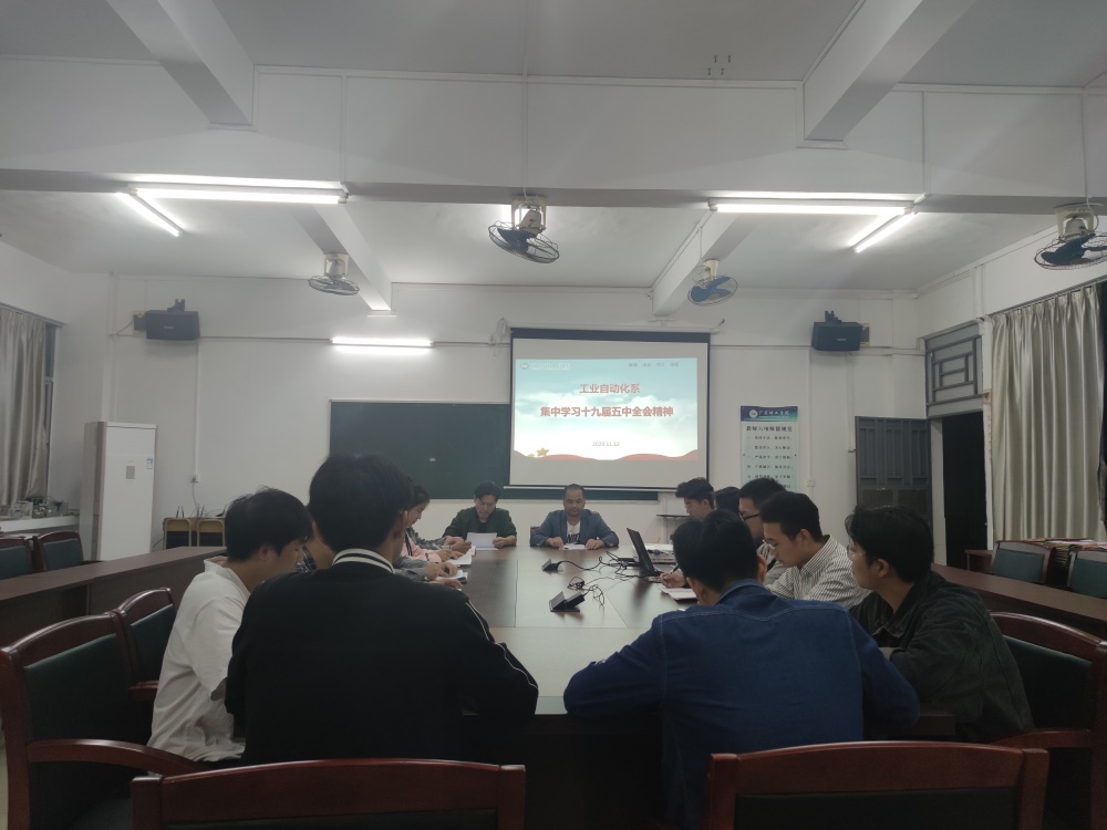 11月12日下午,工业系党总支在9304会议室,组织师生学习党的十九届五中全会精神。工业系党总支苏庚华副书记、学生党支部陈钦腾书记、党员教工和学生党员共同学习。